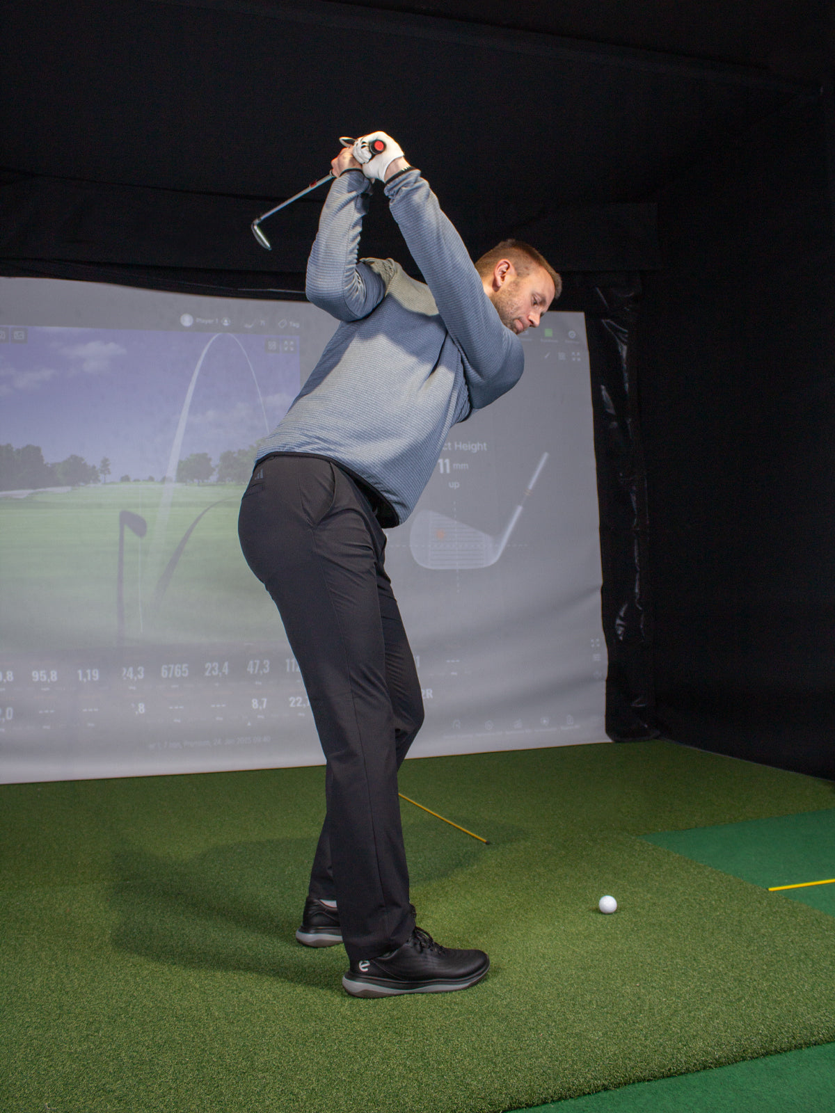 Den sjovere del af fittingen begynder nu. Vi finder forskellige modeller fra flere brands, baseret på det, vi har observeret, og vores snak i starten. Vi bruger vores topmoderne TrackMan til at give os præcise data på dine slag. Vi måler blandt andet boldflugt, carry, spin, sving- og boldhastighed, launch angle og meget mere. Det gør det tydeligt for både dig og os, hvordan de forskellige modeller performer. Derudover kigger vi på lie og skaftlængde. Når du skal teste jern, bruger vi din højde og målet fra håndleddet ned til gulvet – det har nemlig betydning for dine slag, hvis sættet er for kort eller for langt, eller hvis lie er forkert.