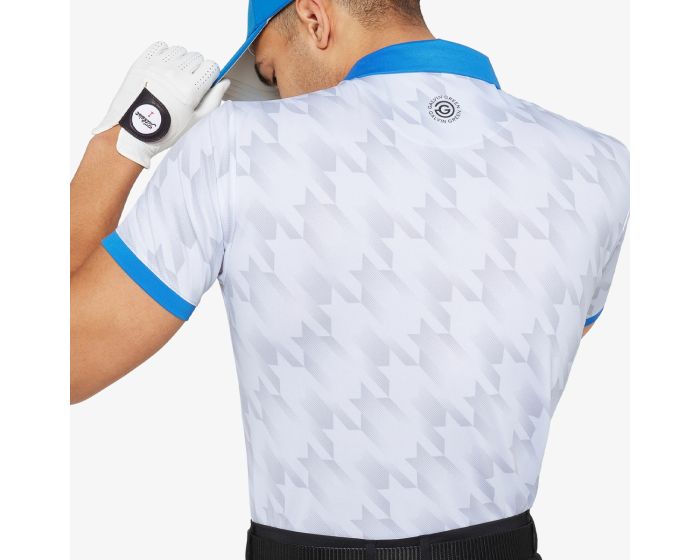 Galvin Green Miles skiller sig ud med et oversized houndstooth-print, der giver et markant og moderne udtryk på golfbanen. Fremstillet i VENTIL8™ PLUS stretchmateriale, som er ekstremt åndbart, hurtigtørrende og giver UV 20+ beskyttelse, hvilket gør den ideel til varme sommerdage. Den bløde kvalitet, kombineret med en skræddersyet krave og elegante ærmeafslutninger med kant, sikrer både komfort og en stilfuld pasform, uden at gå på kompromis med performance.