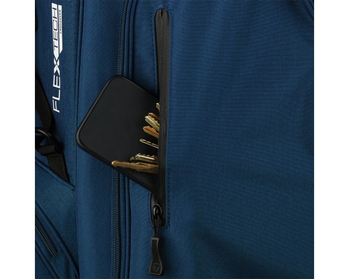 Flextech Crossover er meget alsidig og kan bruges uanset og du går eller skubber. Selerne kan tages af, så når du ikke skal bære den, behøver de ikke at være i vejen. Den har 8 gode lommer, som giver dig plads til alt det du behøver at have med på golfbanen. Når du stiller den, står den solidt med et par gode ben.